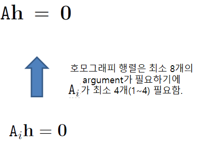 즉 최소한 점 4개에 대하여 위와 같은 방정식을 쌓게 되면 우리는 하나의 Homography 행렬을 구할 수 있게 됩니다.
