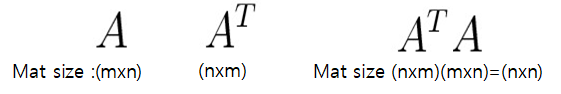 원리는 정말 간단합니다. over-determined인 행렬 A가 존재한다고 했을 때, 해당 행렬 A의 transpose한 행렬 A^T를 곱하게 되면, 우측과 같이 n x n의 정방행렬이 완성됩니다.