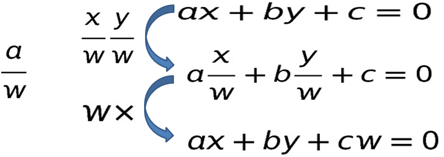그럼 이제 위에 그림에서 첫번째 방정식을 보시면, 해당 방정식은 일반적인 직선의 방정식입니다. 해당 직선의 방정식을, 무한대의 개념을 활용하기 위해 x와 y의 w를 나누는 꼴로 치환을 하게 되면 2번째 방정식이 되고, 양변에 w를 곱하여 마지막 세번째 방정식처럼 만들어 줍니다,