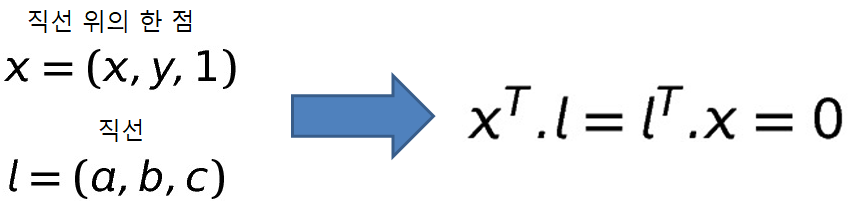 즉 여기서 우리는 점과 직선을 동차 벡터로 나타낼 수 있으며, 점과 직선을 내적하였을 때 결과 값이 0이 나오게 된다면, 해당 점과 직선은, 직선과 직선위의 한 점에 대한 관계라는 것을 알 수 있습니다.