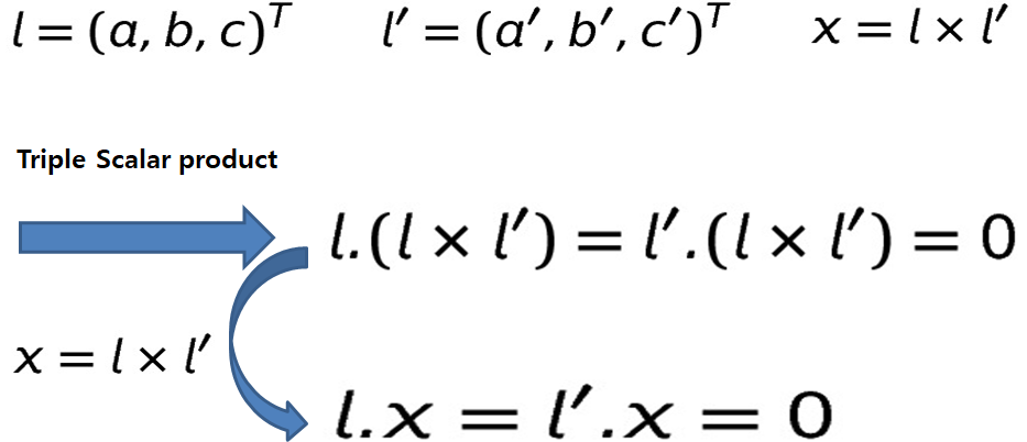 서로 다른 두 직선 l과 l’이 존재하고, 해당 두 직선의 외적하면 나오는 좌표를 점 x의 좌표라고 가정합시다. 서로 다른 두 직선 벡터에 대해서, Triple Scalar product를 진행하게 되면, 0이 나오게 됩니다.