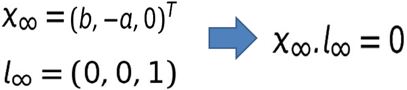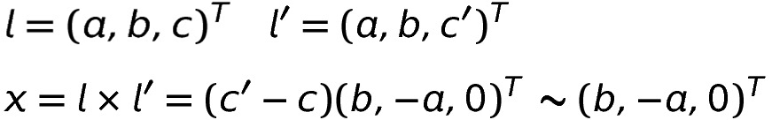 위에 결과를 보면, 두 평행한 직선에 대하여 외적을 해보니, (b, -a, 0)^T 라는 점 좌표가 나오게 되고, 이를 통해 교점이 존재하는가? 라는 생각이 들게 됩니다. 하지만 점 x의 좌표를 비동차 좌표로 변환하게 되면 b와 -a에 0을 나누게 되므로, 해당 식은 성립하지 않는다고 보실 수 있습니다. 즉 두 평행한 직선에 대하여 교점은 존재하지 않는 것이지요.