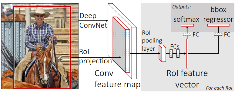 기존방식인 SS에서 얻어진 region각각을 CNN에 넣는 방식이 아니라 이미지를 바로 CNN에 넣기 때문에 기존 2k번에 걸쳐 처리하던 것을 1번으로 줄였습니다.이는 RoI projection,RoI pooling을 통해서 가능하게 되었습니다.SS에서 얻어진 region을 CNN에서 나온 feature map에 투영시키고(이는 input image와 feature map의 spatial resolution이 동일하다고 가정했기 때문에 가능한것입니다.)이후 feature map을 RoI Pooling을 해주어 고정된 output size로 되어 FC layer에 대입이 가능해집니다.즉,이미지를 동일 size로 resize하지 않더라도 FC layer의 바로 전단계에서 모든 인풋의 shape이 동일해지는 것이지요.