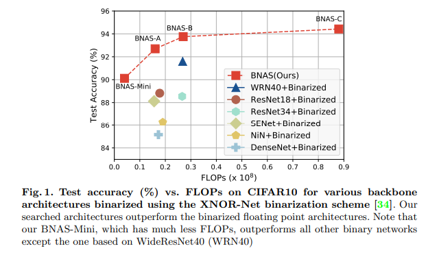 - 첫 번째로 architecture search method for binary network를 제안했습니다. 검색된 아키텍쳐는 FLOP에 따라 조정이 가능하며, NAS에서 많이 비교하는 CIFAR10과 ImageNet에서 SOTA를 달성한 binary network보다 우수한 결과를 냈습니다. (Fig 1. 참고)