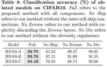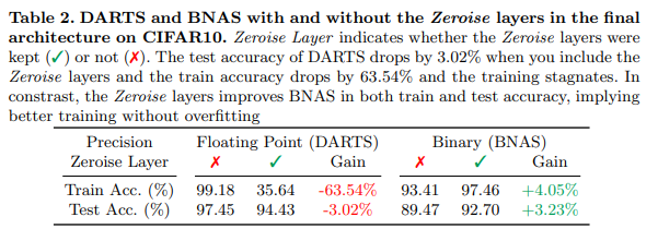 DARTS에서 제안된 Zeroise layer는 입력에 관계없이 포함된 모든 0을 출력합니다. 이는 모델의 연결 부족을 표현하기위해 설계된 layer입니다. 만약에 zeroise layer가 선택된다면, 두번째로 좋은 layer로 대체 합니다. 또는 모든 layer가 zeroise layer로 대체됨으로써 node(cell)간의 연결을 끊는 역할을 합니다. BNAS에서는 더 나아가 zeroise layer를 끊는 역할이 아닌 binary의 sign을 표현하는 하나의 layer로써 사용(topology)합니다. table 2.를 보면 zeorise layer의 유무의 영향이 오버피팅을 방지하며 성능을 향상 시키는 모습을 볼 수 있습니다.