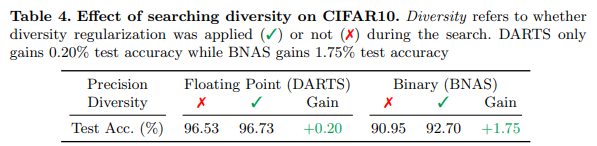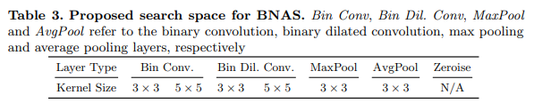 Table 1.을 보면 quantization error로 인해서 binary conv/Dil Conv의 성능적 한계가 존재하는 것을 볼 수 있다. 그렇기에 BNAS에서는 Xnor-net에서 제안한 scheme와 다르게 standard conv/Dil Conv를 search space에 포함합니다.