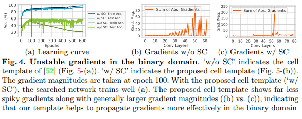 그렇기에 binary network에서 최적의 모델을 찾아내기 위해서는 search space와 cell template이 quantization error에도 강력하게 설계되어야 합니다.