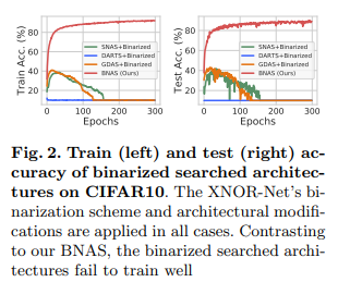 NAS가 CIFAR10과 ImageNet에서 압도적인 성능으로 보여 좋은 방법론이라는 것은 자명한 사실입니다. 그렇기에 보다 좋은 binary network를 얻기 위해서 cell based gradient search methods 방법을 가진 NAS인 GDAS, DARTS, SNAS에 binary network로 유명한 XNOR-Net을 적용하여 시험을 했습니다.(Fig 2.) 실험 결과, 기존 floating point를 사용하는 NAS 방법들은 학습이 안되거나, 진행되면서 성능이 급격하게 안좋아지는 결과를 보였습니다. 이에 대해 저자들은 2가지 이유를 제시했습니다.