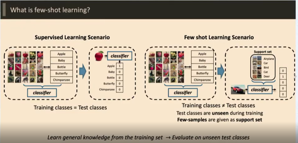 Few Shot learning 이 기존 Supervised learning 이랑 다른 점은, Train과 Test 전부 label이 같냐 안같냐의 차이이다 . 자세히 말하면 , Supervised learning 은 Train에서 학습한 Label을 Test 에서 맞추는 형식 이지만 , Few shot learning은 Train에서 학습 시킨 Label이 Test 에서 없고 Test에 있는 Label은 Train에 없다는 차이가 있다.