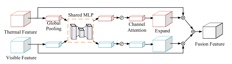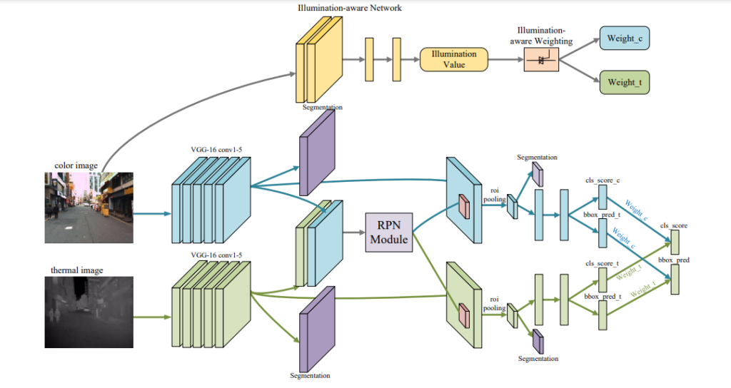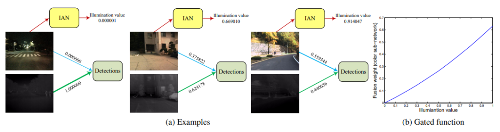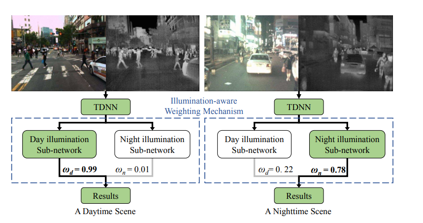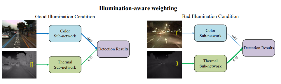 위의 그림에서 왼쪽의 그림은 RGB도 정상적으로 보이는 사진이므로 RGB이미지에 더 큰 가중치를 줘서 Detection을 수행합니다. 반면 오른쪽은 RGB는 Poor한 Illumination을 가지므로 Thermal에 weight를 줘서 Detection을 수행합니다. 그러면 어떻게 이렇게 상황에 따라서 다른 가중치를 생성할 수 있을까요?