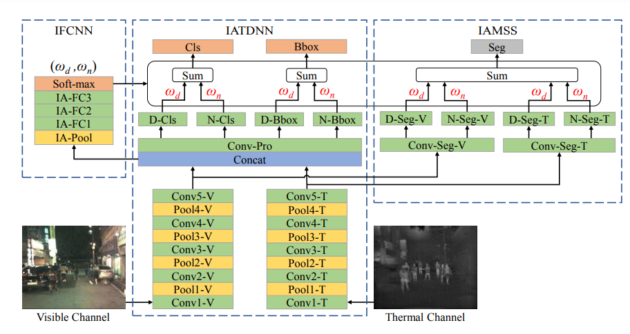 실제 아키텍처를 보면 많이 복잡해 보이지만, 해당 논문에서 제안하는 핵심 컨셉은 위에서 설명한것과 같이 Day,Night에 대해서 각각 SubNetwork를 따로 둔다는 점 입니다. 해당 논문에서는 Detection 뿐만 아니라 Segmentatioin에서도 작동함을 나타내고 있어서 위의 아키텍처를 보시면 IAMSS도 함께 나타내고 있습니다.