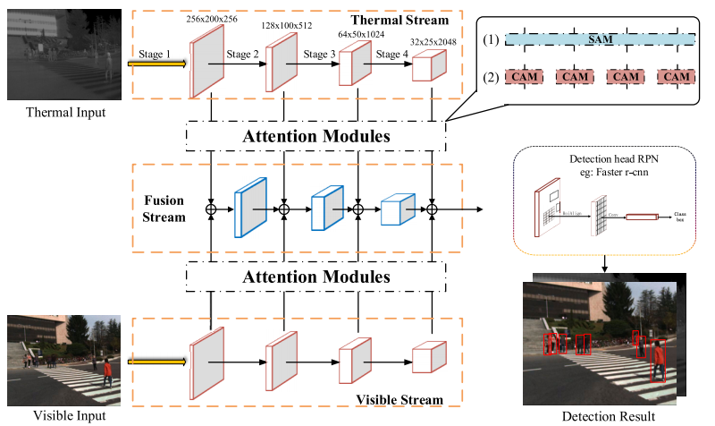 앞서 논문들은 Illumination을 통해서 가중치를 계산했다면 해당 논문은 channel-wise attention module (CAM) and a spatial-wise attention module (SAM) 을 통한 퓨전 방법을 제안합니다. 아래 그림은 전체 아키텍처 입니다.