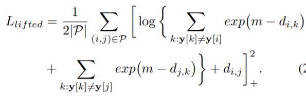 위에 수식은 Lifted Structured Loss 수식입니다. 해당 loss는 anchor와 하나의 positive 끼리는 최대한 가깝게 위치하도록하며, 나머지 모든 negative와 그에 대응하는 positive들 끼리는 고정된 마진 값보다 더 멀리 위치하게끔 설계되어있습니다.