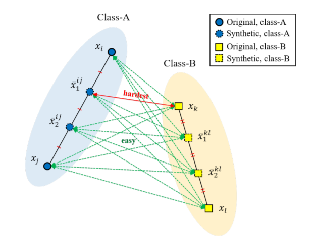 각 클래스에서 두 개의 original embedding을 추출한 다음, 해당 임베딩들을 지나는 직선에 내분점으로 합성 임베딩을 생성합니다.