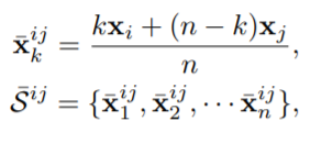 x_{i], x_[j} 는 어떤 class 내의 original embedding들을 의미하며, k에 따른 내분점으로 생성된게 x bar입니다. 그리고 이러한 내분점들의 집합이 2번째 수식인 S bar 입니다.