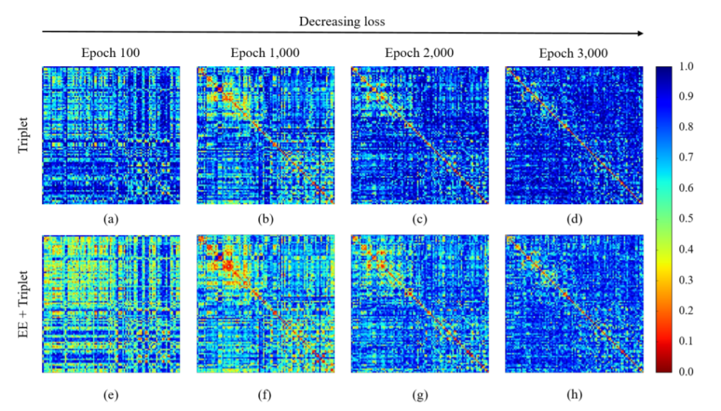 해당 그림에서 알 수 있는 것은, EE를 붙인 loss의 heat map이 훨씬 yellow~red 영역에 가까운 것을 확인할 수 있는데, 이러한 yellow~red 영역은 더 짧은 pair distance를 의미합니다.