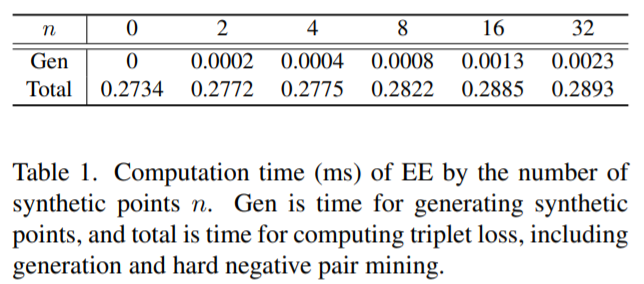 아래 표는 embedding expansion을 통해 합성 임베딩을 만드는 시간을 나타낸 것입니다. 임베딩을 32개를 만드는데, 0.0023 ms 걸리는 것으로, 기존 base triplet loss가 0.2734 ms 걸린다는 것을 감안했을 때, EE를 적용하는 것은 매우 작은 시간이 소요된다는 것을 확인할 수 있습니다.