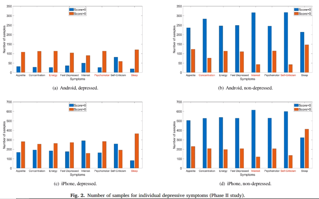 위의 표는 임상결과(실제 정신과 전문의 상담) 우울증이 있는 사람과 우울증이 없는 사람이 PHQ-9에 응답한 결과입니다.(참고로 2군집으로 나눠서 실험을 진행했기 때문에 표가 Phase 1, Phase 2 로 나타내고 있습니다) 앞서 표에서 보시면 0~3점까지 스코어를 매겼는데 해당 논문에서 실제 2~3점을 체크한 사람은 거의 없기 때문에 질문에 대한 대답을 데이터로 만들때 1점 이상이거나, 0점이거나 2가지로 분류했다고 합니다. 근데 실제 데이터를 봐도 임상결과 우울증이 없는 사람들은 대부분이 0점을 표기했기 때문에 이런식의 분류가 가능함을 설명하고 있습니다. 위에서 빨간색은 해당 증상이 있다고 표기한 사람들(1점 이상) 그리고 파란색은 0점입니다. 아 그래고 위에 표를 보시면 X축이 8개인걸 볼텐데 PHQ-9은 9개라서 당황하셨죠?? 빠진 항목은 자살경험이나 자살시도와 관련된 질문인데 이와 관련된 질문은 거의 모든 사람들이 0이라서 제거했다고 합니다. (실제 그럴것이 자살을 매번 시도하는 피실험자의 경우는 실험에 참가해달라고 할게 아니라 당장 병원에서 치료를 받게 해야하겠죠…)