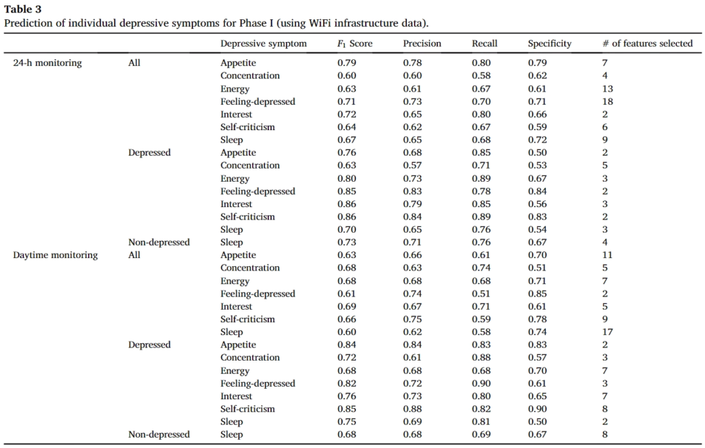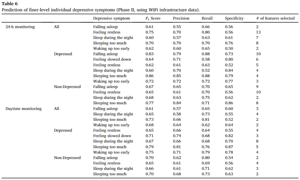 앞서 리포팅한 결과는 Depressive symptoms에 관한 정확도를 나타냈다면, 이제는 finer-level에서 두 결과를 비교하면 다음과 같다. 처음 결과는 스마트폰 센싱 데이터를 사용한 결과이며, 두번째는 WiFi 데이터를 사용한결과이다.