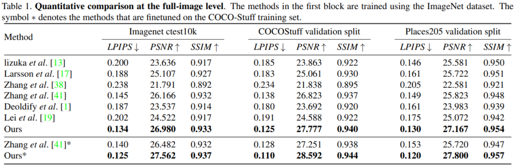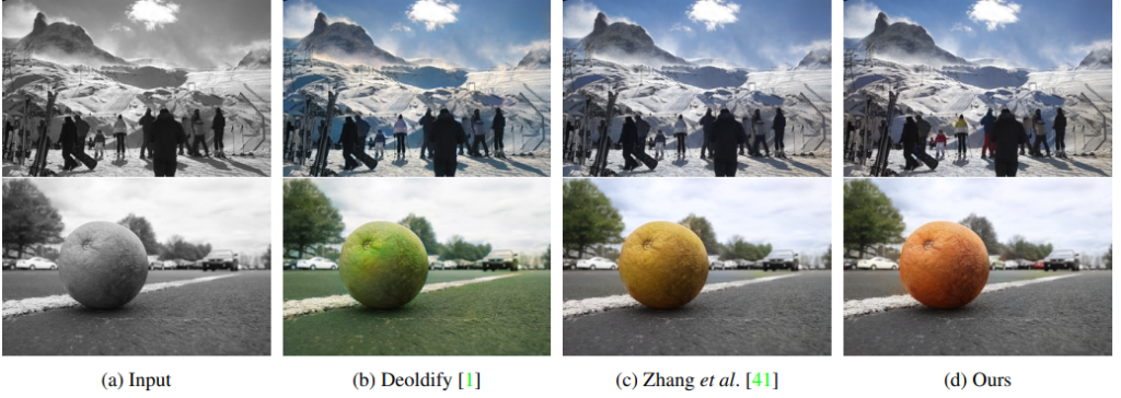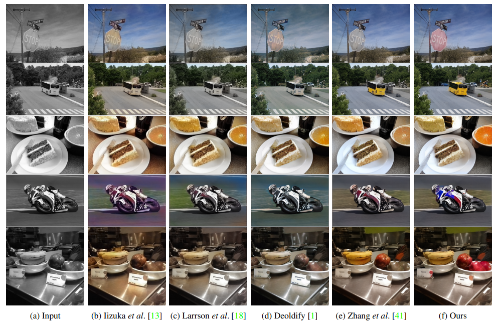 input 영상에 대해서 colorization을 했을 때 다수의 물체 및 특정 background에서는 해당 논문의 기법(제일 우측)을 제외한 다른 방법론들은 물체의 정확한 colorization이 안됨.(특히 2번째 column)