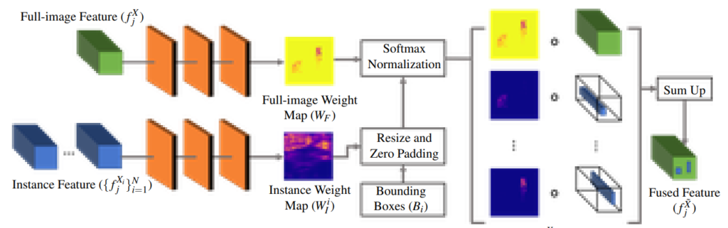 그리고 나서 각 instance feature( f^{X_{i}}_{j}를 full-image feature(f^{X}_{j})와 fusion하게 됩니다. 이 때 instance feature의 크기와 위치를 정의해주는 bounding box(B_{i})를 input으로 사용하게 됩니다.