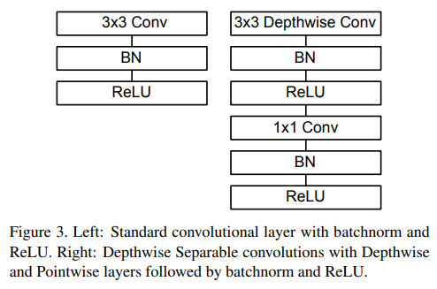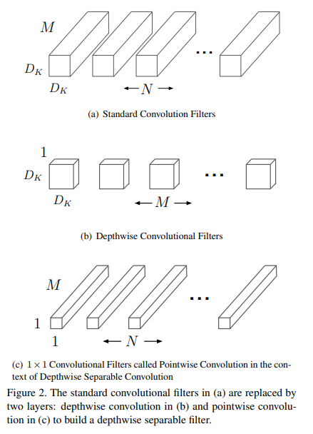 해당 논문에서는 기존 CNN에서 사용하는 point-wise conv(Fig 2. (a) Standard Convolutional Filters)를 변경하여 channels 나누어( channel=1) 연산(Depth-wise Convolution) 하고 1×1 kernel을을 사용함으로써 계산량을 줄이는 방법(Fig 2. (b), (c) -> Separable Convolutions)을 사용합니다.