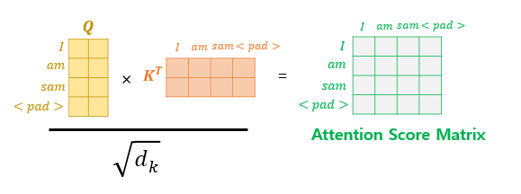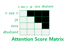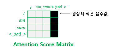 Padding mask 는 Self-Attention에서 계산되어집니다. <pad>라는 문장이 Padding mask에 해당합니다. 해당 값은 -1e9라는 아주 작은 음수 값으로 대체 되며, Q, K가 dot-product가 되면서 Fig 9-1과 같이 아주 작은 값을 가지게 되며, 0에 가까운 값을 가지면서, 마스킹을 하게 됩니다.