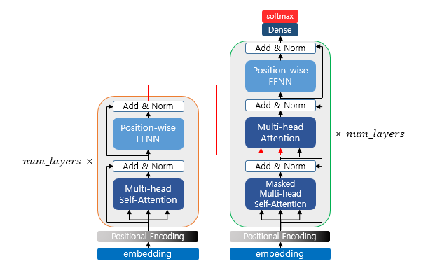 Encoder의 마지막 층의 값 중 Key K, Value V 값이 입력 값으로 들어가며, look-ahead mask를 통해 미래 시점의 값이 mask된 Query Q 값이 입력값을 사용되어집니다. 그럼으로써 Decoder는 미래 시점 예측을 학습 할 수 있도록 됩니다.