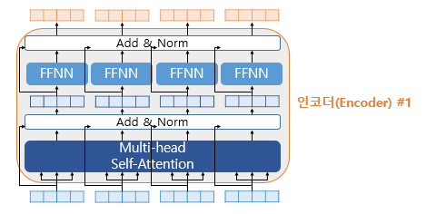 Position-wise FFNN는 쉽게 혹은 다르게 표현하자면 MLP, Fully-connected NN입니다. Multi-head Self-Attention으로 된 값이 사용되며, Fig 10-2에서는 따로 표현되어 서로 다른 layer로 보이지만, 실제로는 weight, bias를 공유하는 하나의 층입니다.