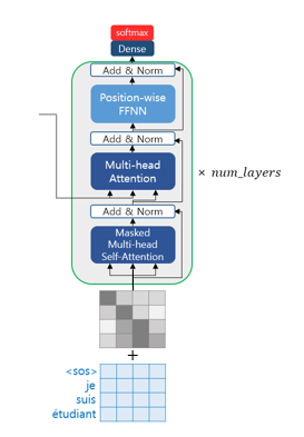 Decoder에서도 Encoder와 유사한 구조를 가졌으며, 입력 문장에 포지셔닝 인코딩을 거친 값들이 입력 데이터로 사용됩니다. Encoder와의 차이점은 입력 문장 행렬로부터 각 시점의 단어를 예측하도록 훈련이 됩니다. 하지만 아쉽게도 기존 방법과 동일하게 모든 문장간 dot-product 이용한 연산의 특성상 미래 시점의 단어까지도 참고할 수 있는 현상이 발생합니다. 이를 해결 하고자 Transformer에서는 look-ahead mask를 사용합니다.
