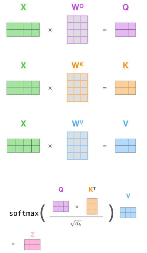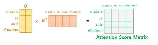 두 단어의 유사도에 대한 Score는 q와 k의 dot-product로 계산이 됩니다. 그 후, dim(q)^1/2로 scaling을 해주고 softmax로 확률적인 연산 후, 가중치인 V를 dot-product하여 attention score Z를 계산합니다.