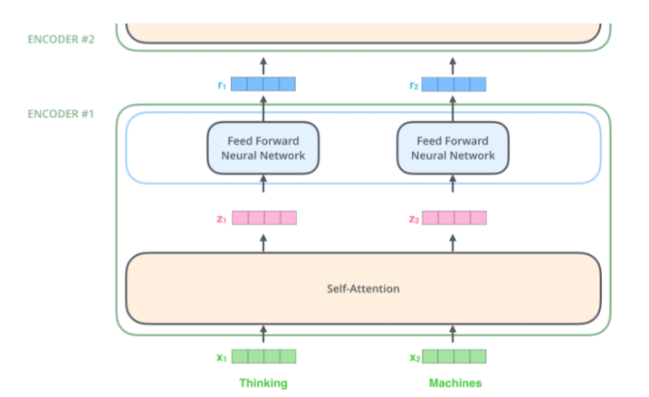 Transformer의 Encoder는 Fig 2와 같이 self-attention layer와 feed-forward neural network로 이뤄져 있습니다.