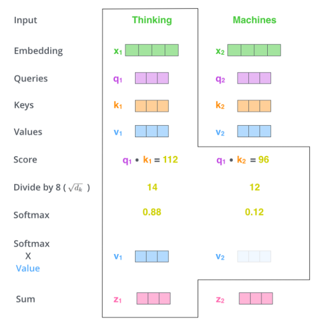 Queries(q)는 영향을 받는 단어 A를 나타내는 변수, Key(k)는 영향을 주는 단어 B를 나타내는 변수, Value(v)는 q-k간 영향에 대한 가중치, Embedding(x)는 단어 A의 임베딩 벡터 입니다. dim(q) = dim(k) = 64 dim, dim(x) = 512을 가집니다.