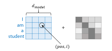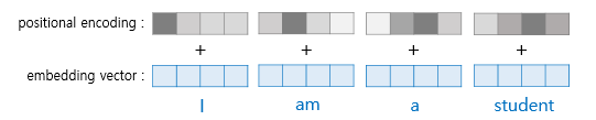 Transform은 RNN의 recurrence를 대체 하기 위해서, 즉 시간에 따른 정보의 흐름, 혹은 위치를 알고 있어야 합니다. Transform에서는 각 단어의 임베딩 벡터에 위치 정보들을 더하여 모델의 입력으로 사용합니다. 이를 Positional encoding 이라고 합니다.