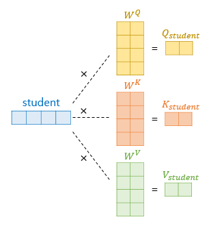 각 가중치는 d_model x (d_model/num_heads) 차원을 가집니다. num_heads는 아래에서 설명드릴 Multi-Head Attention의 개수이며, 논문에서는 8개를 가집니다. 그럼으로 512 x 512/8 = 512 x 64 차원을 가진 가중치 행렬 나옵니다. 각 단어들은 position encoding이 더해진 512차원의 임베팅 벡터와 가중치 행렬(512 x 64) dot-product를 함으로써 64차원을 가진 Q, K V 벡터가 나옵니다.