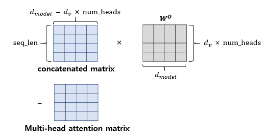 여러 head가 생기면서 Sum z vector 가 많아지면서 차원이 맞지 않아 decoder에서 사용하기 힘들어집니다. 이를 W(weight matrix)를 곱해줘서 차원을 맞춰 해결합니다.
