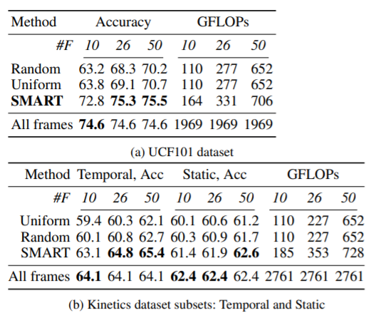 (a) UCF101, (b) Kinetics subset에 대하여 #F개의 프레임을 선정하였을 때 Random, Uniform selection보다 성능이 좋고 일부는 All frames을 이용하였을 때 보다 좋은 성능을 보임을 확인할 수 있다. 그러나 GFLOPs로 확인할 수 있는 연산량을 고려하면 SMART가 가장 좋은 성능을 보인다.