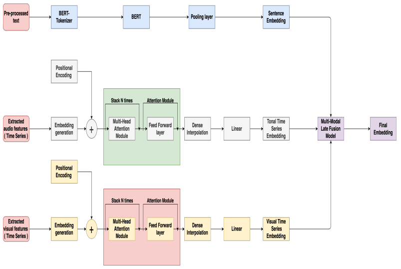정리해서 설명하자면 해당 논문에서는 질문에 대한 응답을 BERT를 통해서 Sentence Embedding, Time Series의 Audio Feature로 Tonal(음색의) Time Series Embedding, 그리고 Visual Feature로 Visual Time Series Embedding을 만들고 이러한 Multi Modal의 임베딩을 Late Fusion하여 최종적으로 우울증을 예측하는 논문입니다.