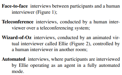 본 논문에서는 학습을 위해서 AVEC depression dataset 데이터셋을 사용했다고 합니다. 해당 데이터셋은 4개의 타입으로 피실험자를 인터뷰한 데이터셋이며, 피실험자의 PTSD 및 주요 우울증의 증상이 있는 사람들의 특성을 컴퓨터로 예측하기 위해 수집하였다고 합니다. 해당 AVEC depression dataset에서 사용한 인터뷰의 종류는 다음과 같습니다.