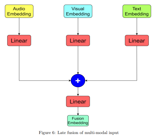 따라서 본 논문에서도 해당 아키텍처를 그대로 사용했다고 합니다. 오디오와 비주얼 데이터는 시퀀스 데이터기 때문에 Simply Attend and Diagnose 아키텍처를 통해서 임베딩 벡터를 추출하고 텍스트는 RoBERTa 를 통해 임베딩 벡터를 추출해서 마지막에 Fusion을 수행하였습니다. 다음 그림과 같이..