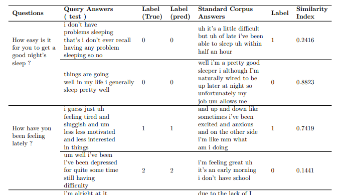 이는 본 논문에서 제안하는 피실험자의 응답을 통해서 클래스 라벨링을 한 결과를 나타냅니다, 여기서 Similarity index는 특정 라벨의 정답이 되는 답변과 피실험자의 답변의 유사도를 나타내는데, 이를 통해 같은 클래스에 속한 피실험자들은 높은 유사도를 보였고, 클래스 라벨의 경계(스코어가 임계값 부근인 케이스)의 피실험자들은 유사도가 낮았다고 합니다. 이를 통해 우울증의 증상정도를 구별할 수 있다고 합니다.