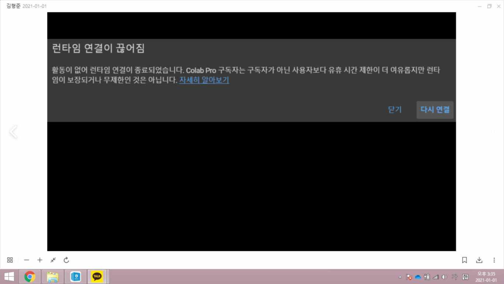 해당사진은 코랩프로도 런타임이 끊기기는 한다는 것을 보여줍니다. 확실히 일반코랩보단 그 주기가 더 길었습니다.
