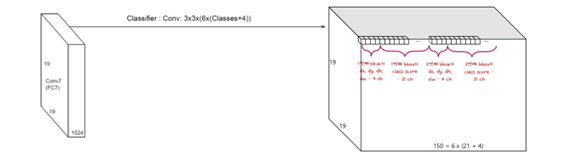 즉 위와같은 그림처럼 feature map이 뽑히게 됩니다. 좀 더 이해를 돕기위해 pascal VOC를 기준으로 설명 하겠습니다. pascal VOC는 20개의 class label과 background로 나뉘게 됩니다. 즉 총 21개의 class를 갖습니다. bounding box를 6개씩 뽑아낸다고 했을때, 총 6*(21+4)=150개씩의 정보를 가집니다. 이때 6은 bounding box의 갯수이고, 21은 class의 갯수, 4는 bouding box의 위치정보입니다. 즉, 3*3 convolution을 할때 chanel을 150으로 설정하면 각 location마다 해당 정보(bounding box좌표, class마다 확률)들을 담고있는 150개의 채널의 feaure맵이 나오게됩니다.