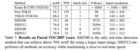 conv layer들은 stride를 증가시켜 feature map을 점점 작게 뽑아내게끔 설계되어 있습니다. feature map의 사이즈를 작게하는 방법에는 여러가지 방법이 있지만 해당논문에서는 stride를 늘리는 방법을 택하였고 일반적으로 많이 사용되는 방법입니다. SSD의 가장 큰 특징인 이렇게 중간중간에서 추출된 feature map들을 활용하는데 있습니다. 이러한 방법은 OD나 segmentation에서 많이 사용되는 방법입니다. 하지만 이때 당시만해도 feature map의 사이즈를 다르게해서 뽑아내는 형식의 방법론은 획기적이었습니다. 아래에서는 논문에서처럼 욜로와 비교하는 위주로 서술을 이어가겠습니다.