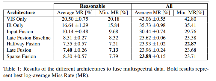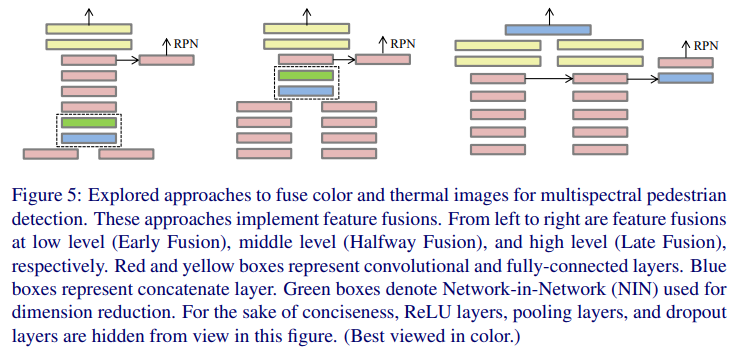 해당 논문은 처음 딥러닝 기반으로 Multispectral Pedestrian Detection을 제안하였고, 다음 그림과 같이 실제 어디서 RGB와 Thermal 데이터를 Fusion 할때 성능이 가장 좋은지 실험을 통해서 제안해 현재까지도 이 분야에서 많이 인용되고 있습니다.