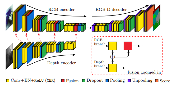 Sparse Fusion : 해당 방법은 FuseNet 에서 제안한 방법으로 FuseNet에서는 Unet을 베이스로 RGB와 D를 합쳤다면, 저자들은 RGB와 Thermal을 합쳤다고 합니다. 밑에 그림은 FuseNet에서 가져온 아키텍처 그림입니다.