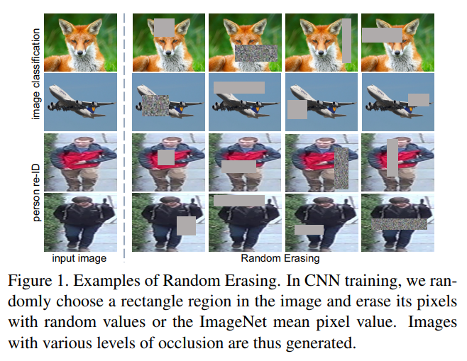 Random Erasing : 해당 방법은 ” Random Erasing Data Augmentation “에서 소개된 방법으로 실제 Object에서 사각형의 모형으로 일부분을 지울경우 모델이 더욱 일반화 되면서 성능을 향상시키는 방법입니다. 본 논문에서도 이를 Multispectral data에 적용하였으며, RGB와 Thermal 동일한 위치를 지우는 방식으로 구현했다고 합니다. 컨셉의 이해를 돕기위해 Random Erasing Data Augmentation 논문에서 아래 그림을 발췌하였습니다.