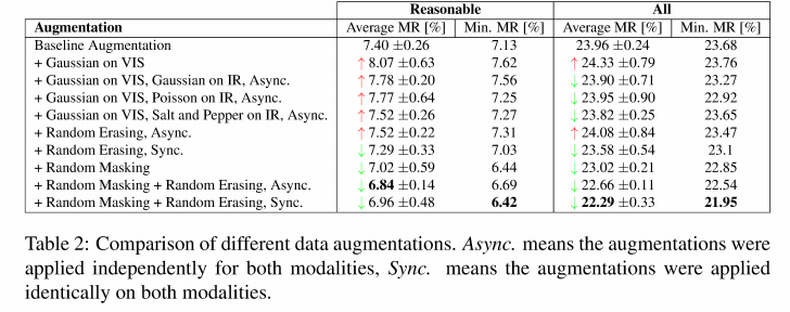 Proposed Random Masking : 해당 방법은 새로운 방법으로 Random Erasing을 좀 더 발전시킨 방법으로 해당 방법론을 RGB와 Thermal의 랜덤으로 적용하는 방법론 입니다. 50%의 확률로 RGB나 Thermal의 이미지 전체를 0으로 만드는 방법이라고 합니다. (이거 저희가 제안한 FTT랑 완전히 동일한 컨셉이네요)
