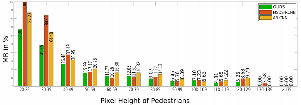 그리고 전체 데이터셋에 대해서 실제 GT Annotation에서 나타난 Pedestrian 크기에 따른 성능도 분석하였습니다.
