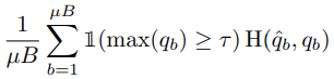 FixMatch에 사용되는 방법 중 나머지 하나인 Pseudo-labeling은 Unlabeled 데이터에서 모델이 스스로 인공적인 label을 만들고 사용하는 것을 말합니다. 좀 더 자세하게 말하자면 모델은 예측 내의 최대 확률이 사전 정해둔 임계값을 초과하는 경우에만 hard assign하여 사용하게 됩니다. 이처럼 일정 임계값을 초과하는 hard label만을 사용하는 것은 unlabeled 데이터들 중 entropy가 낮은 (confidence가 높은) 것만을 모델에 제공하기 때문에 결과적으로 모델의 entropy minimization에 기여하게 됩니다. 이러한 영향을 주는 Pseudo-labeling은 식 (2)와 같이 표현됩니다. \tau 는 hard assign을 결정하는 임계값, \hat{q_b}=argmax(q_b)를 의미합니다.